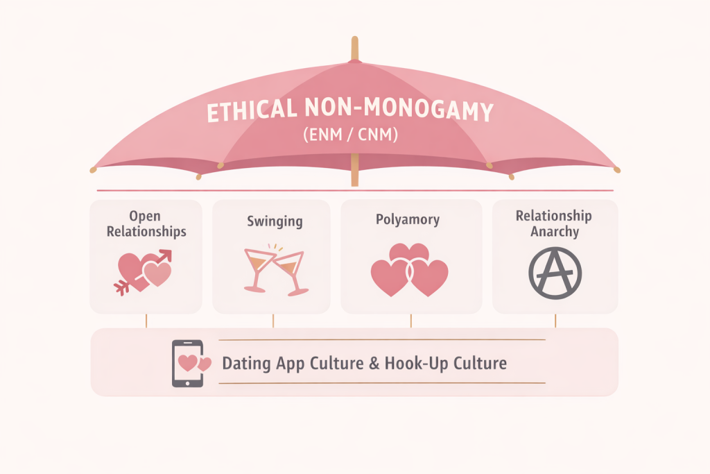 Ethical non-monogamy is best understood as an umbrella category that includes multiple relationship styles built around consent, communication, and transparency. These styles vary widely in how people organize romance, sexuality, autonomy, and community.